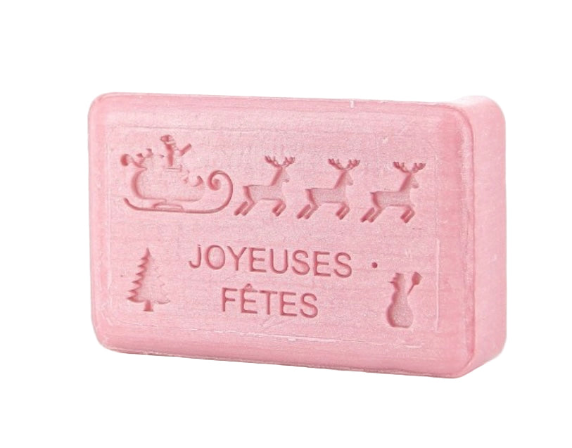 Savonnette de Noël estampillée Joyeuses Fêtes avec un jolie décor de Noël composé d'un sapin, d'un bonhomme de neige et du Père Noël sur son traineau avec ces rennes. Rose, délicatement parfumé, il dégage une bonne odeur gourmande qui fait penser au sucre d'orge.