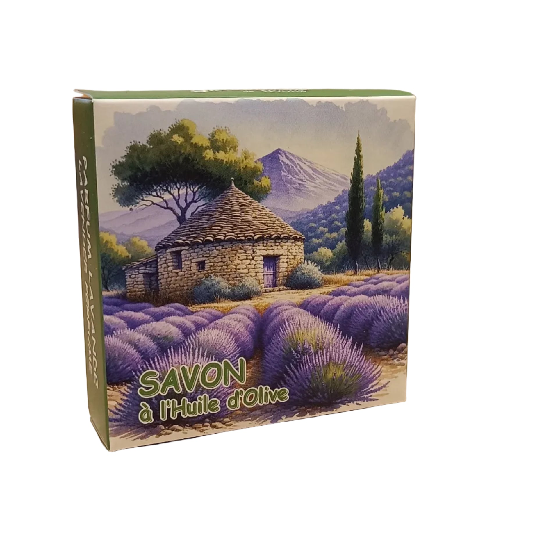 Savon de 100g La Borie Perché au parfum de lavande dans son étui cartonné.